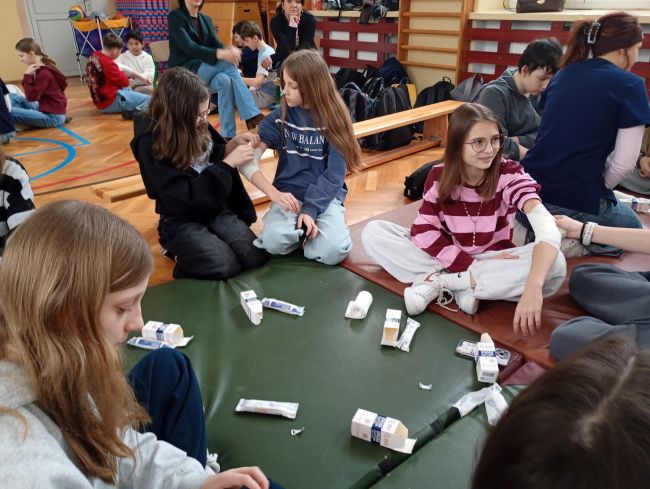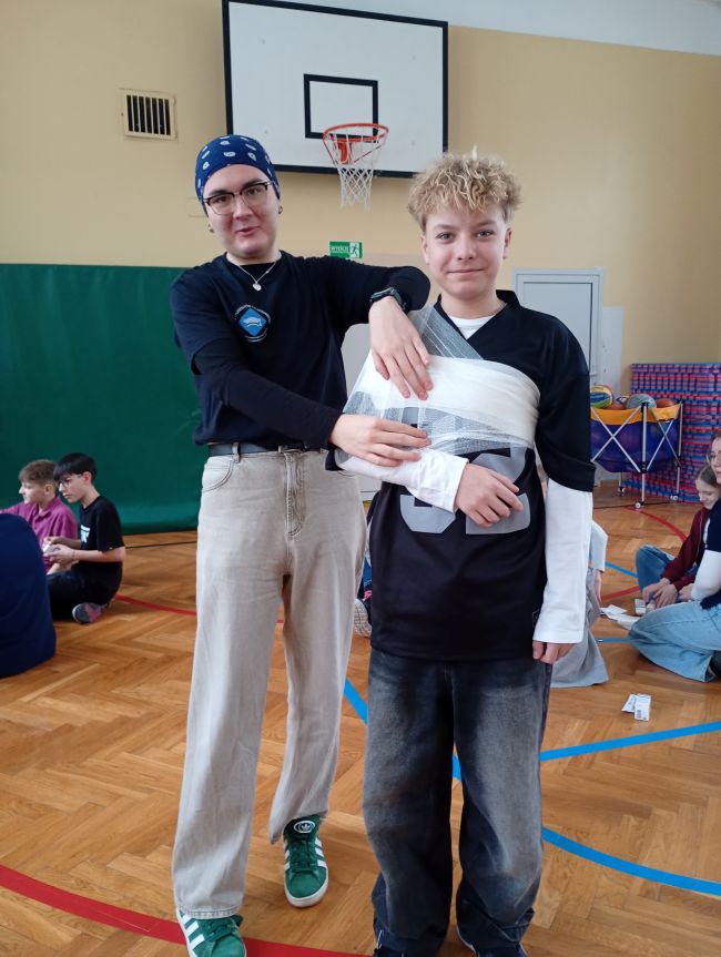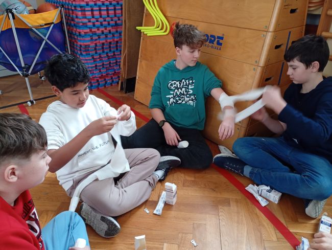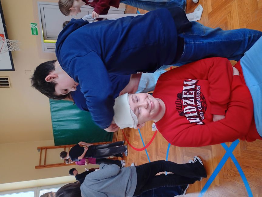 Zajęcia dla uczniów klas szóstych miały charakter warsztatowy – wiedza teoretyczna została przełożona na praktykę. W małych grupach, pod opieką studentów, uczniowie poznawali zasady właściwego bandażowania, które stanowi jeden z elementów udzielania pierwszej pomocy.